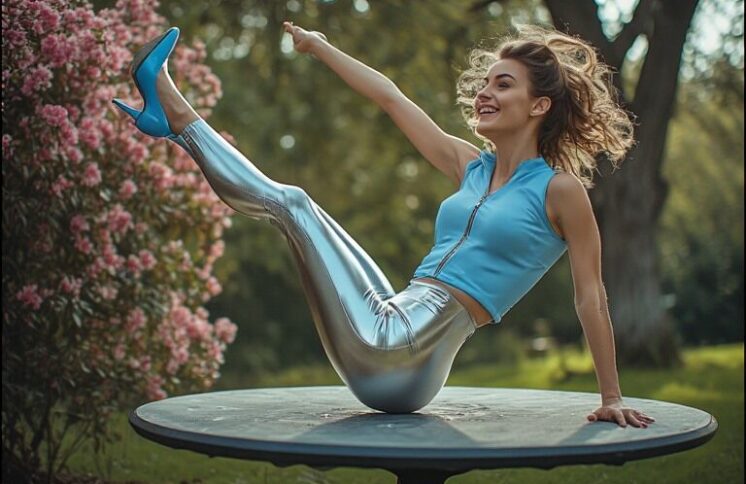 Jumping in a garden is more than just fun it’s a playful celebration of energy, style, and joy. With the right spot, a bold outfit, and a genuine smile, even metallic wetlook leggings and high heels can turn every leap into a magical, photogenic moment among flowers and sunlight.
