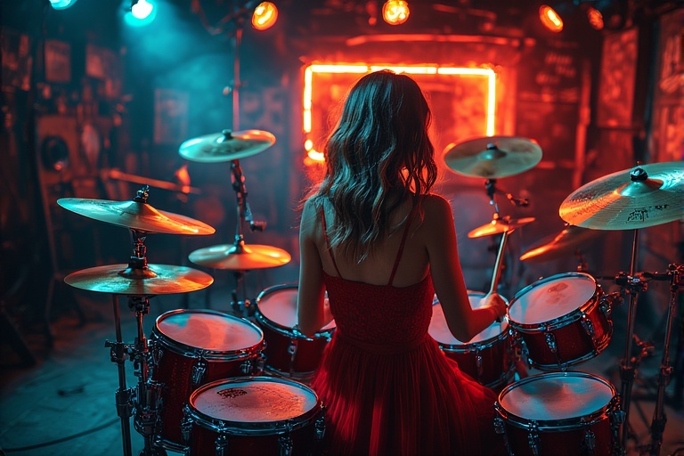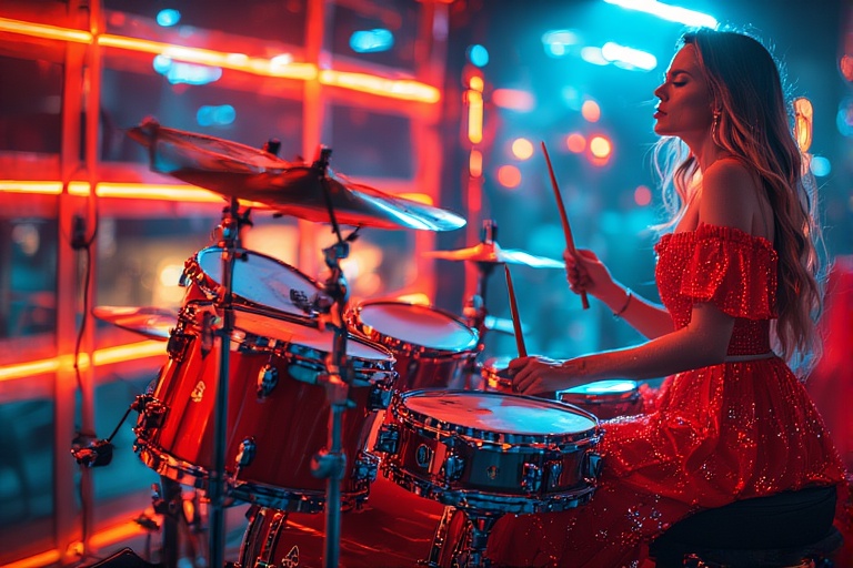 Today’s video introduces us to a striking scene: a woman in a bold red dress playing the drums under neon lights. The contrast between her elegant outfit and the raw, powerful instrument creates a captivating visual balance. The red dress is not just clothing—it becomes part of the performance, symbolizing passion, strength, and intensity. Each strike of the drum resonates not only as sound but as energy flowing through the room.