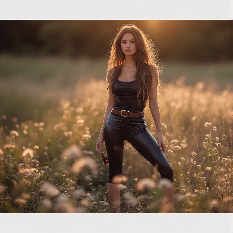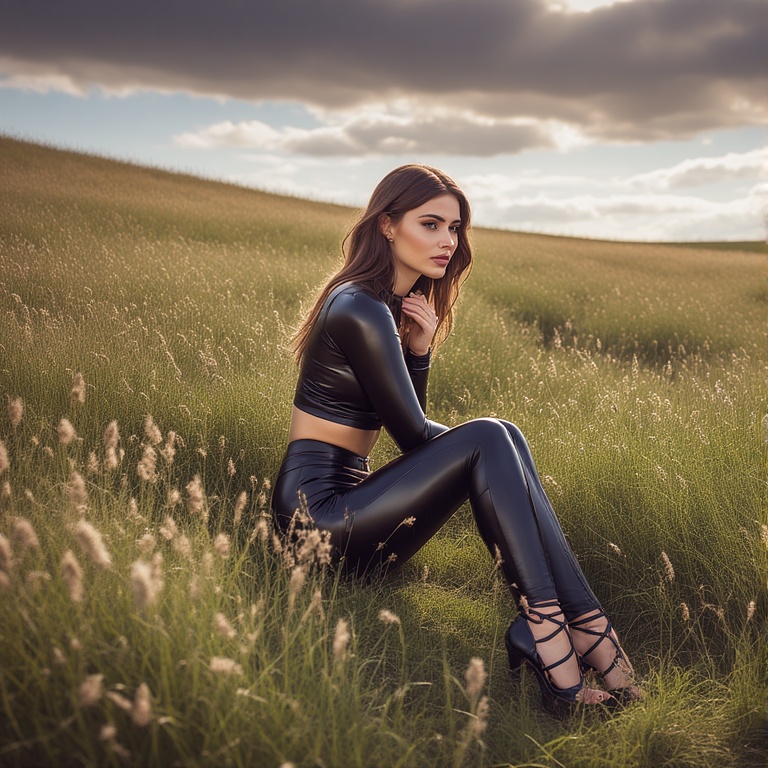 This video brings together two worlds that don’t often meet—high fashion and the great outdoors. A girl steps into view wearing a short black latex top and matching leggings, her outfit sleek, shiny, and undeniably bold. On her feet, tall sandals complete the look, elongating her figure and giving her presence a runway-worthy edge.