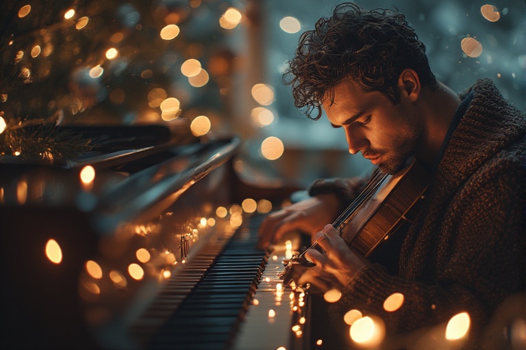 Closer to the center, a musician plays soft Christmas melodies on a violin. His notes float through the air like falling snow — gentle, delicate, full of nostalgia. People slow down without meaning to. They listen. They breathe. They remember.
