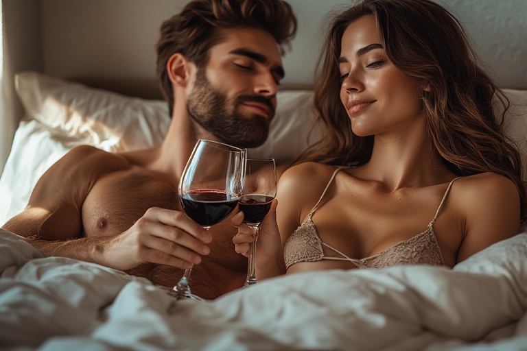 Confidence mode: activated. She lifts her leg and places it right on him — playful, bold, and absolutely unapologetic. At this point, the wine is clearly in charge.