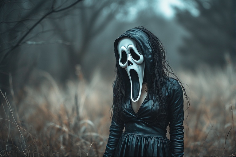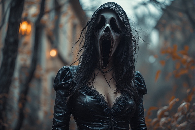 Today’s video starts like an ordinary walk, but the visual immediately sets a different tone. A woman dressed entirely in black stands alone, wearing a white scream-style mask that instantly captures attention. Her outfit is minimal and sleek, sharply contrasting with the bright, expressionless mask. The dark clothing emphasizes her silhouette, while the mask hides every trace of emotion, turning her into a mysterious figure rather than a recognizable face. 🖤🎭