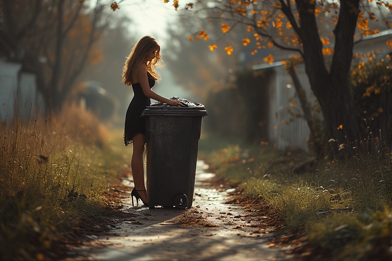 Instead of heading to a party, a date, or a luxury venue, she calmly walks outside to take out the trash. 🗑️😄
