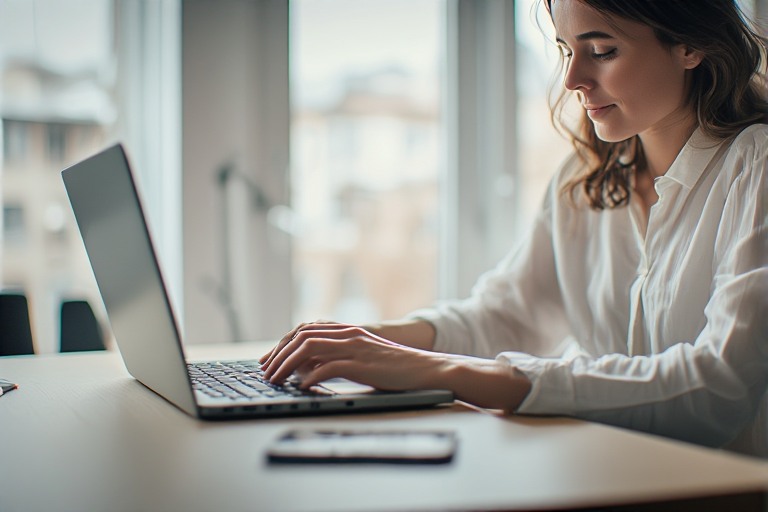Working online can sometimes feel like you’ve become one with your laptop. Our lady, dressed in her crisp white office blouse, sits focused in front of her screen, typing away like a productivity machine. But let’s be honest staying productive and happy takes more than just staring at emails all day. Here are three quick tips to survive (and enjoy) your workday, plus what to do after you finally log off.