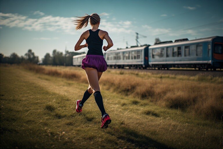 Jogging is already refreshing but jogging with a passing train in the background? That’s cinematic fitness at its finest. Our lady, dressed in a black tank top, a playful purple skirt, black socks, and running shoes with red accents, jogs confidently across an open field. As the train rolls by behind her, she turns an ordinary run into a moment worth remembering. Here are five points to consider if you want to level up your jogging game.