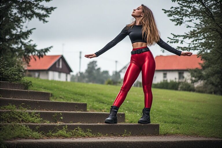 Her black long sleeve cropped top pairs effortlessly with her bold red shiny wetlook leggings,