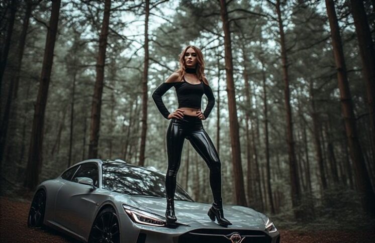 Jumping on a car isn’t just for action movies it’s bold, fun, and full of style. With shiny wetlook leggings, a cut-out top, and black boots, our adventurous lady turns a simple leap into a cinematic, confidence-boosting moment. Surrounded by tall trees and sunlight, every jump becomes playful, empowering, and unforgettable.
