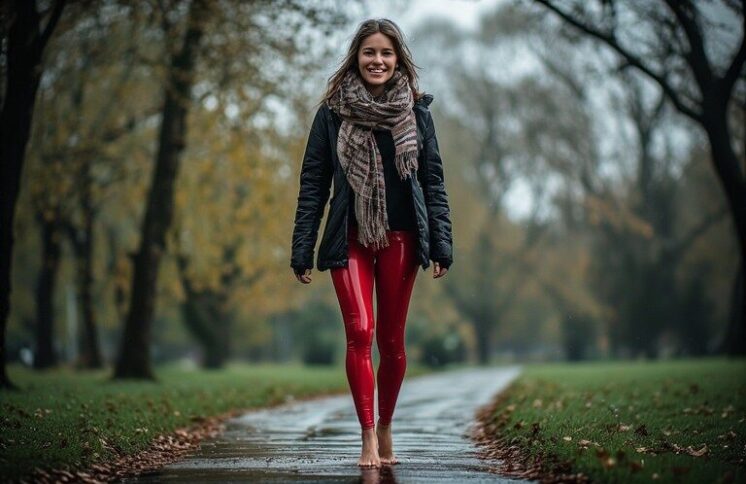 After a fresh rain, walking barefoot turns the park into a magical playground. Nina’s shiny red wetlook leggings, black jacket, and striped scarf add style, while the soft grass, glimmering puddles, and playful steps create pure joy. Each movement twirls, spins, and puddle splashes makes this simple stroll a memorable, carefree adventure.